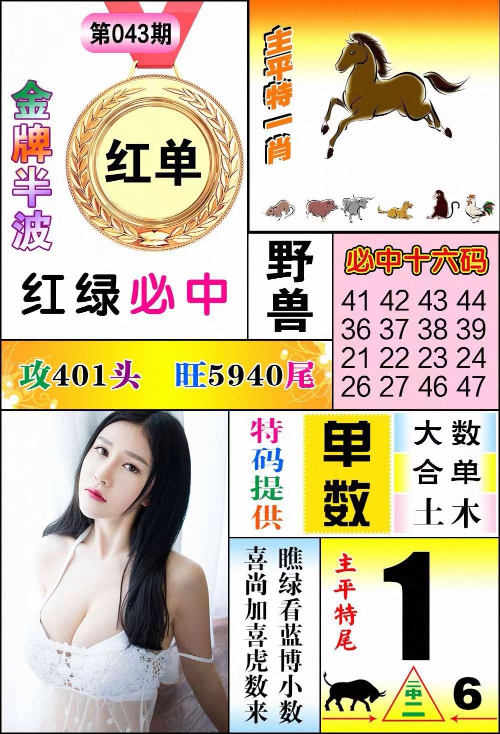 | 043期 | 红波+绿波 | 野兽+牛狗 | 单数+马鼠 | 3.7尾 |