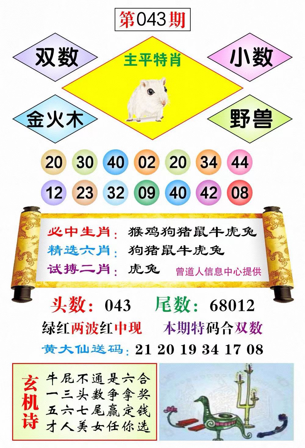 | 043期: 助您横财<鼠>稳坐钓鱼台 开:?00准 |