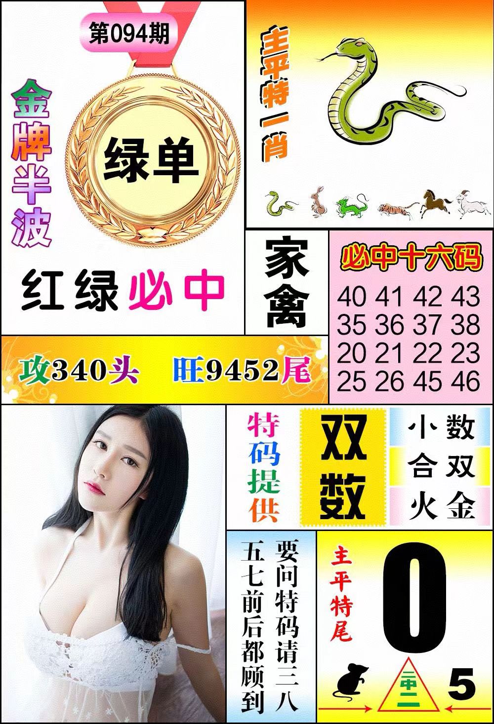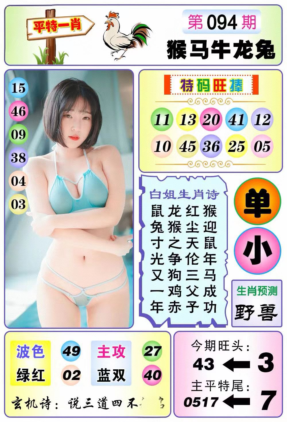 | 094期 | 绿波+红波 | 家禽+鼠猴 | 单数+兔蛇 | 3.8尾 |